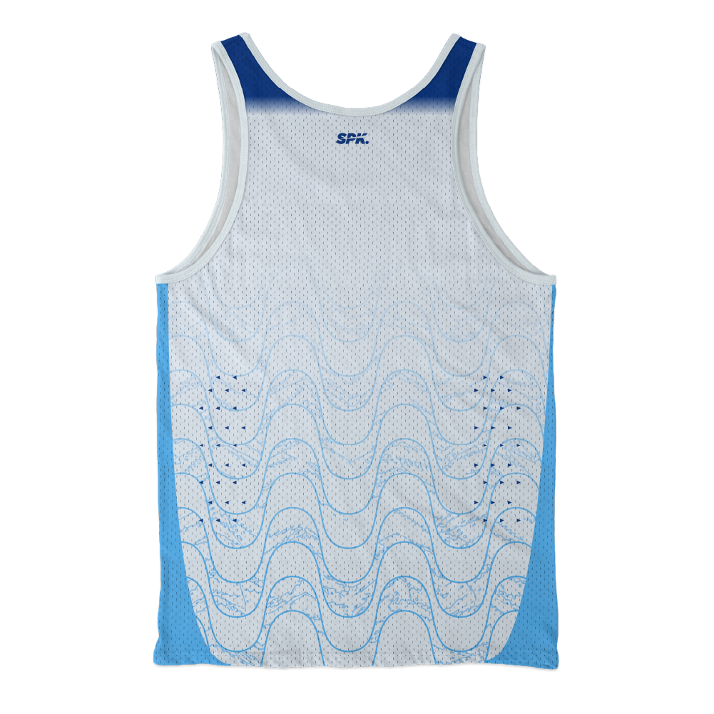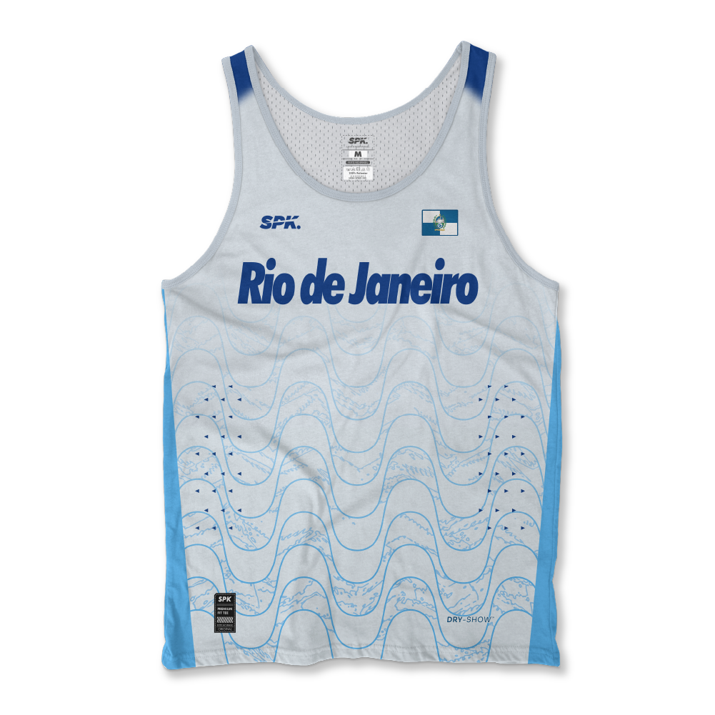 O design exclusivo combina o branco, azul marinho e azul claro, em um visual moderno, limpo e cheio de identidade. O destaque especial fica para as ondas do Calçadão de Copacabana, eternizadas como símbolo da cidade maravilhosa e agora estampadas na regata com muito estilo. Além disso, ela traz o nome “Rio de Janeiro” no peito, reforçando a ideia de união, pertencimento e orgulho de carregar o nome do estado em cada corrida.