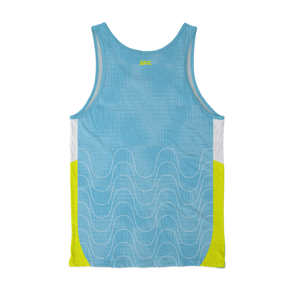 O design exclusivo combina azul claro, amarelo fluorescente e branco, em um visual vibrante e cheio de energia. O destaque especial fica para as icônicas ondas do Calçadão de Copacabana, um símbolo eterno da cidade maravilhosa estampado na regata com muito estilo. Além disso, ela traz o nome “Rio de Janeiro” estampado no peito e a bandeira do estado no lado esquerdo, reforçando a identidade carioca em cada detalhe.